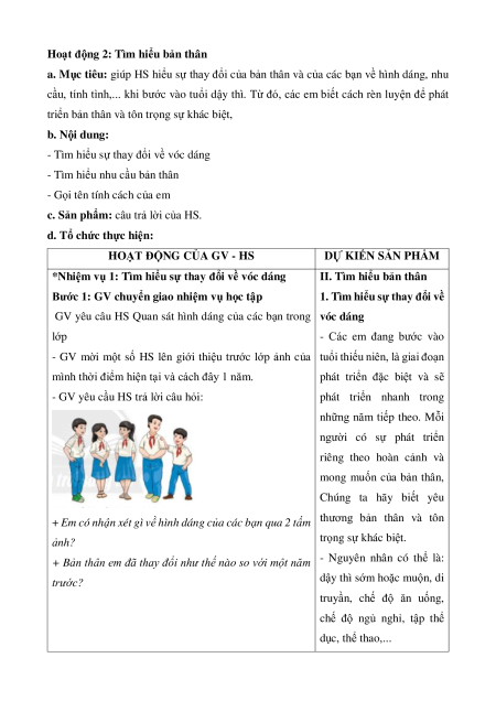 a. Mục tiêu: giúp HS hiểu sự thay đổi của bản thân và của các bạn về hình dáng, nhu