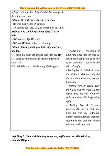 - Chia sẻ tình huống và rút ra ý nghĩa của tính kiên trì và sự chăm chỉ.