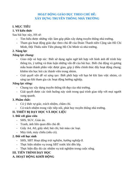 - Tìm hiểu và nêu được những việc làm góp phần xây dựng truyền thống nhà trường.