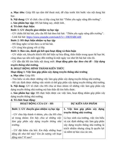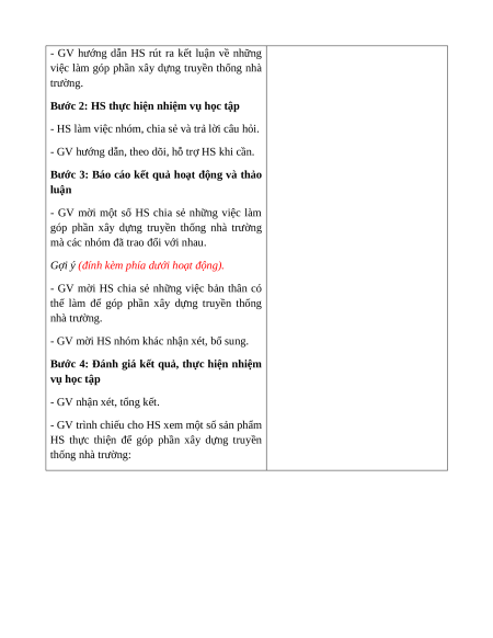 - HS xác định được những việc mình có thể góp phần xây dựng truyền thống nhà trường.