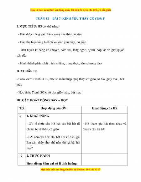 TUẦN 12 BÀI 7: KÍNH YÊU THẦY CÔ (Tiết 2)