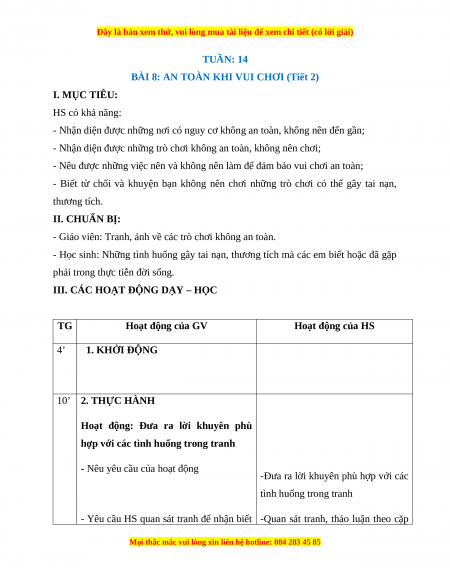 BÀI 8: AN TOÀN KHI VUI CHƠI (Tiết 2) I. MỤC TIÊU: HS có khả năng:
