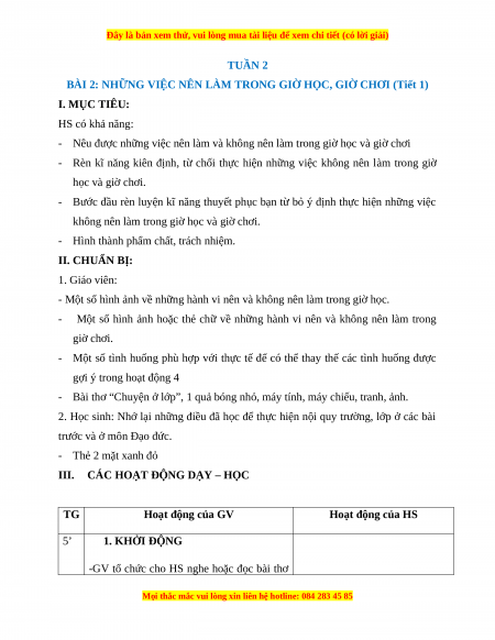 BÀI 2: NHỮNG VIỆC NÊN LÀM TRONG GIỜ HỌC, GIỜ CHƠI (Tiết 1) I. MỤC TIÊU: HS có khả năng: