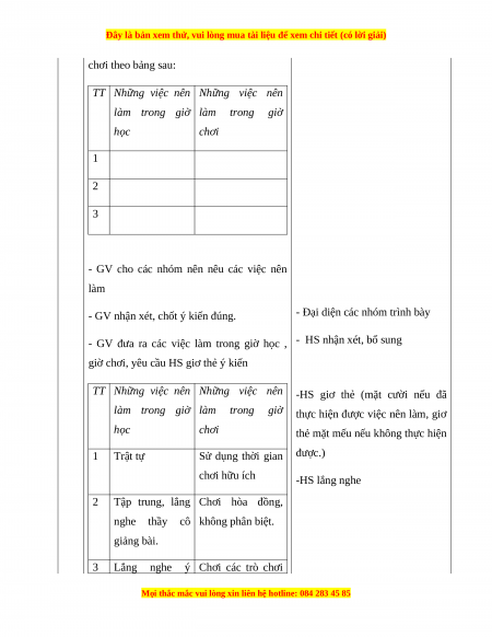 - Nêu được những việc nên làm và không nên làm trong giờ học và giờ chơi