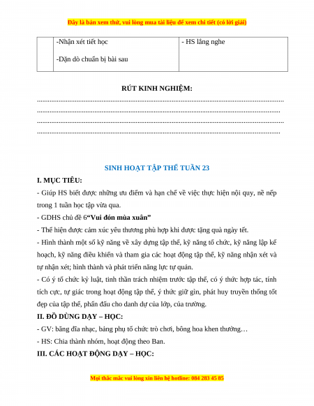 SINH HOẠT TẬP THỂ TUẦN 23 I. MỤC TIÊU: