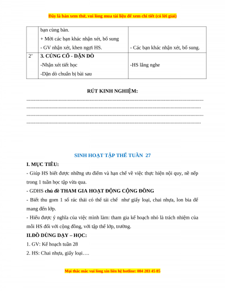 SINH HOẠT TẬP THỂ TUẦN 27 I. MỤC TIÊU: