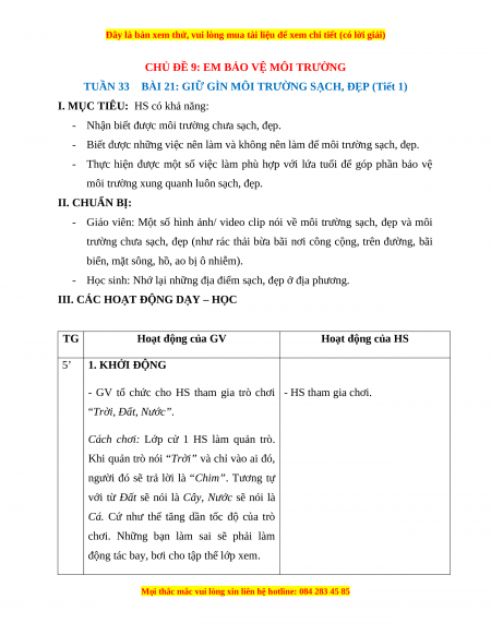TUẦN 33 BÀI 21: GIỮ GÌN MÔI TRƯỜNG SẠCH, ĐẸP (Tiết 1)
