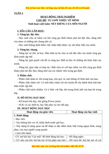 Sinh hoạt cuối tuần: NÉT RIÊNG CỦA MỖI NGƯỜI I. YÊU CẦU CẦN ĐẠT: 1. Năng lực đặc thù: