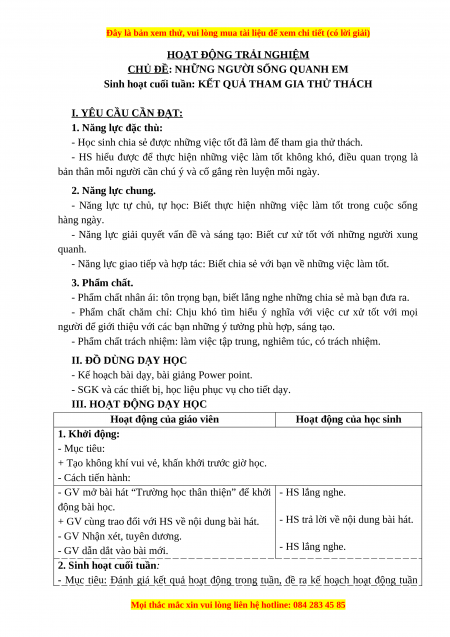 Sinh hoạt cuối tuần: KẾT QUẢ THAM GIA THỬ THÁCH I. YÊU CẦU CẦN ĐẠT: 1. Năng lực đặc thù: