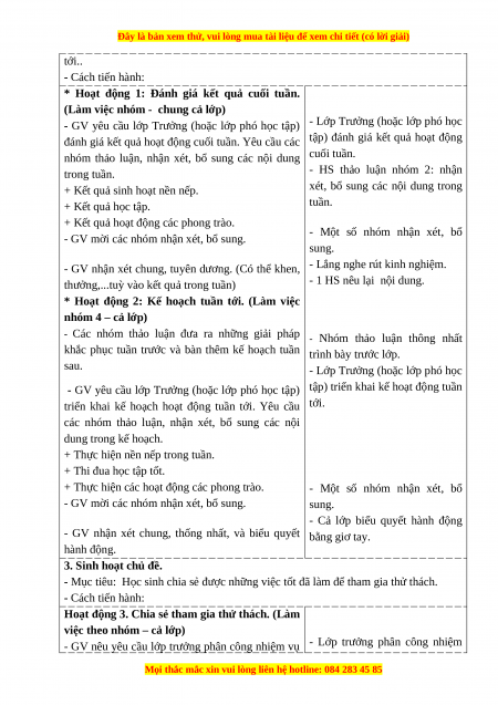 - Mục tiêu: Đánh giá kết quả hoạt động trong tuần, đề ra kế hoạch hoạt động tuần