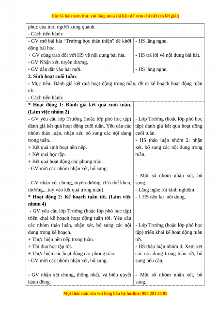 - Mục tiêu: Đánh giá kết quả hoạt động trong tuần, đề ra kế hoạch hoạt động tuần