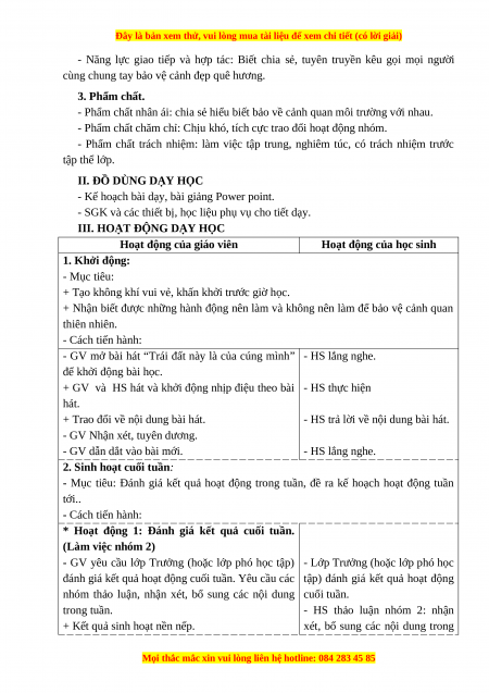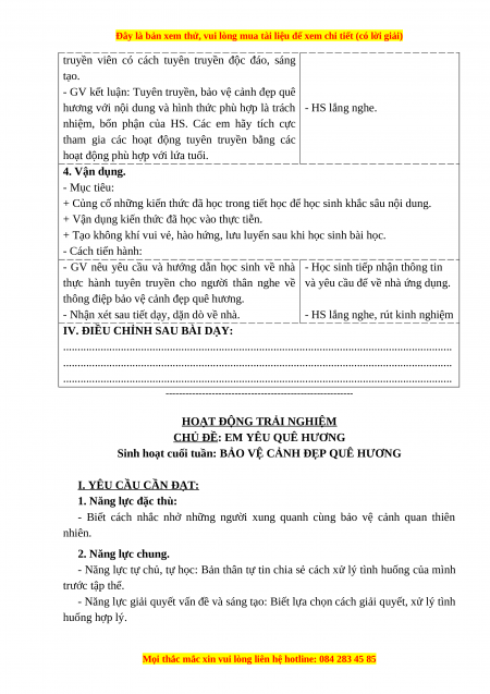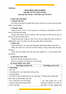 Sinh hoạt cuối tuần: BẢO VỆ CẢNH ĐẸP QUÊ HƯƠNG I. YÊU CẦU CẦN ĐẠT: 1. Năng lực đặc thù: