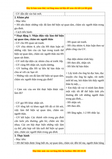 + HS nêu được những việc đã làm thể hiện sự quan tâm, chăm sóc người thân trong gia đình. - Cách tiến hành: