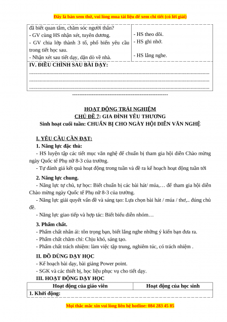 Sinh hoạt cuối tuần: CHUẨN BỊ CHO NGÀY HỘI DIỄN VĂN NGHỆ I. YÊU CẦU CẦN ĐẠT: 1. Năng lực đặc thù: