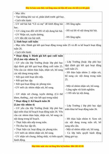 - Mục tiêu: Đánh giá kết quả hoạt động trong tuần 25 và đề ra kế hoạch hoạt động