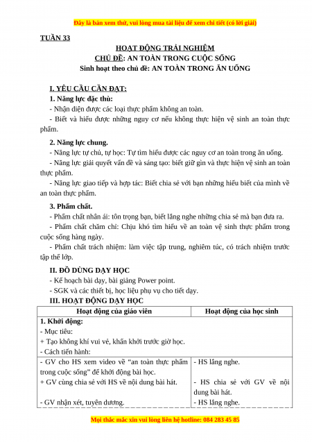 Sinh hoạt theo chủ đề: AN TOÀN TRONG ĂN UỐNG I. YÊU CẦU CẦN ĐẠT: 1. Năng lực đặc thù: