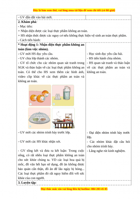 + HS nhận thức được các nguy cơ nếu không thực hiện vệ sinh an toàn thực phẩm. - Cách tiến hành: