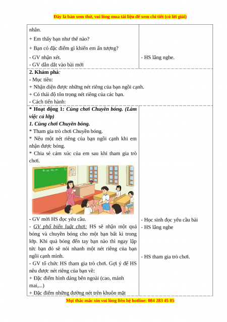 * Nêu một nét riêng của bạn ngồi cạnh khi em nhận được bóng.