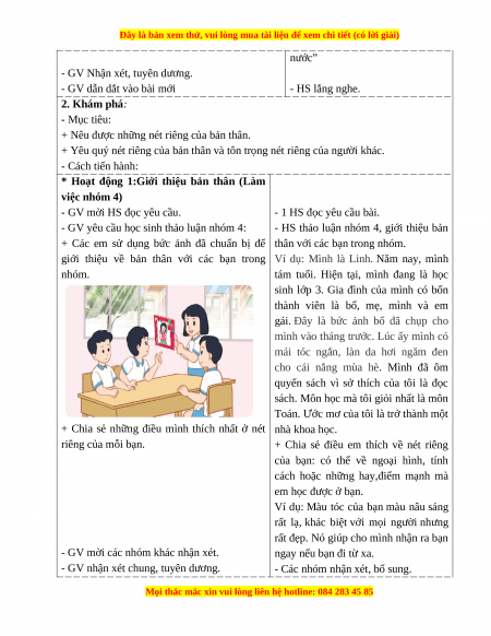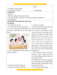 - Năng lực giao tiếp và hợp tác: Biết chia sẻ với bạn về những nét riêng của các bạn. 3. Phẩm chất.