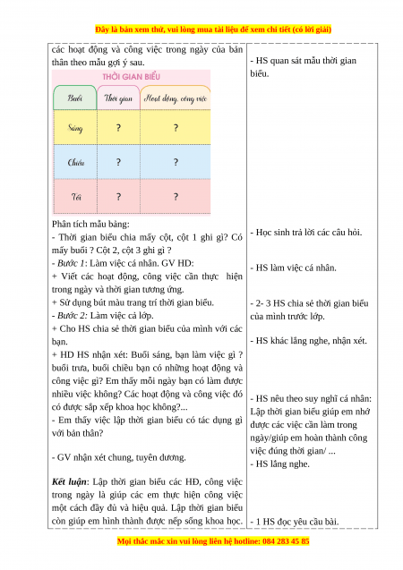 - HS quan sát mẫu thời gian biểu. Phân tích mẫu bảng: