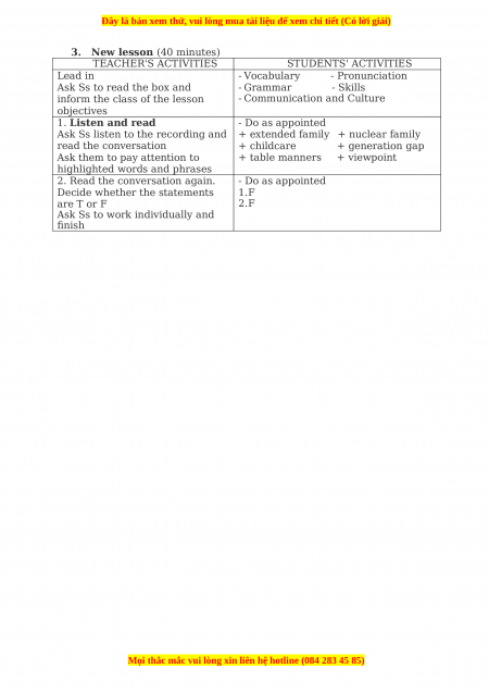 3. New lesson (40 minutes) TEACHER'S ACTIVITIES STUDENTS' ACTIVITIES Lead in - Vocabulary - Pronunciation Ask Ss to read the box and - Grammar - Skills