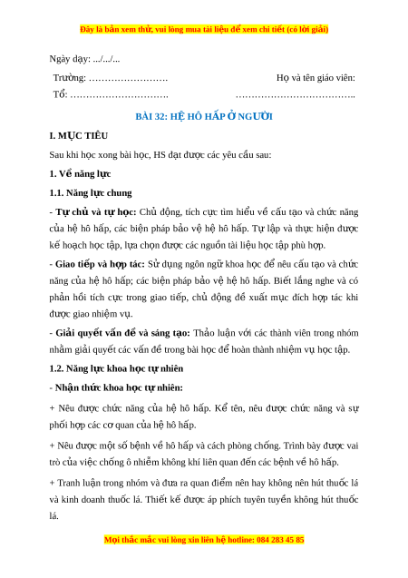 ớ các thành viên trong nhóm nh m ằ gi i ả quy t ế các v n đ ấ ề trong bài h c ọ đ hoàn t ể hành nhi m ệ v h ụ c t ọ p. ậ 1.2. Năng l c khoa h ự c t ọ nhi ự ên - Nhận th c ứ khoa h c ọ t nhi ự ên: + Nêu đư c ợ ch c ứ năng c a ủ hệ hô h p. ấ Kể tên, nêu đư c ợ ch c ứ năng và sự phối h p các ợ c quan c ơ a ủ h hô h ệ p. ấ + Nêu đư c ợ m t ộ s ố b nh ệ v ề hô h p ấ và cách phòng ch ng. ố Trình bày đư c ợ vai trò c a vi ủ c ch ệ ống ô nhi m