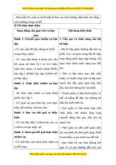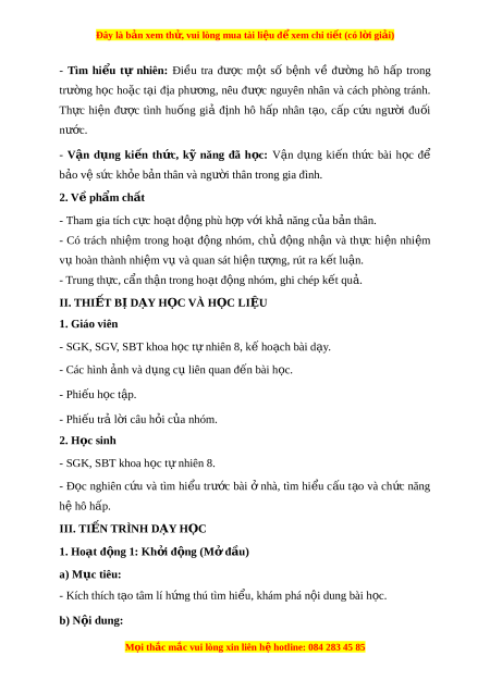 ứ kỹ năng đã h c: ọ V n ậ d ng ụ ki n ế th c ứ bài h c ọ để b o ả v s ệ c kh ứ e ỏ b n t ả hân và ngư i ờ thân trong gia đình. 2. V ph ề ẩm ch t ấ - Tham gia tích c c ự ho t ạ đ ng ộ phù h p v ợ i ớ kh năng c ả a b ủ n ả thân. - Có trách nhi m ệ trong ho t ạ đ ng ộ nhóm, chủ đ ng ộ nh n ậ và th c ự hi n ệ nhi m ệ v hoàn ụ thành nhi m ệ vụ và quan sát hi n t ệ ư ng, ợ rút ra k t ế lu n. ậ - Trung th c, ự c n t ẩ h n t ậ rong ho t ạ đ ng nhóm ộ , ghi chép k t ế qu . ả II. THIẾT B D Ị ẠY H C Ọ VÀ H C Ọ LI U Ệ 1. Giáo viên - SGK, SGV, SBT khoa h c ọ t nhi ự ên 8, k ho ế ch ạ bài d y ạ . - Các hình nh và d ả ng c ụ ụ liên quan đ n bài ế h c. ọ - Phi u h ế c t ọ p. ậ - Phi u t ế rả l i ờ câu h i ỏ c a ủ nhóm. 2. H c ọ sinh - SGK, SBT khoa h c ọ t nhi ự ên 8. - Đ c ọ nghiên c u ứ và tìm hi u ể trư c ớ bài ở nhà, tìm hi u ể c u ấ t o ạ và ch c ứ năng hệ hô hấp.