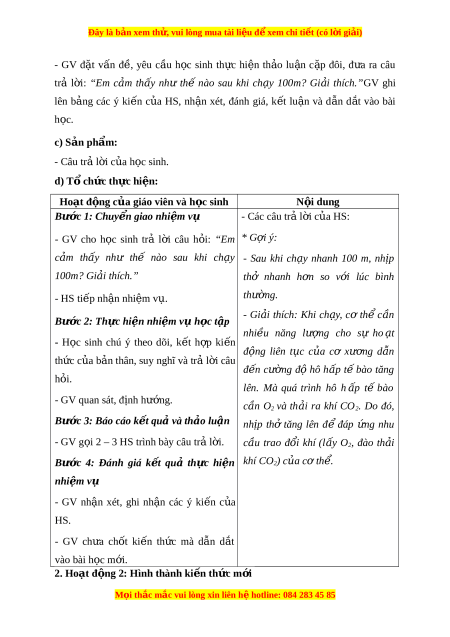 ấ như thế nào sau khi ch y ạ 100m? Gi i ả thích.”GV ghi lên b ng ả các ý ki n ế c a ủ HS, nh n ậ xét, đánh giá, k t ế lu n ậ và d n ẫ d t ắ vào bài h c. ọ c) S n ph ả m ẩ : - Câu tr l ả i ờ c a ủ h c s ọ inh. d) T ch ổ ức thực hi n: ệ Hoạt đ ng c ộ a ủ giáo viên và h c ọ sinh N i ộ dung Bư c ớ 1: Chuy n gi ể ao nhi m ệ vụ - Các câu trả l i ờ c a ủ HS: - GV cho h c ọ sinh trả l i ờ câu h i ỏ : “Em * G i ợ ý: c m ả th y