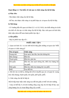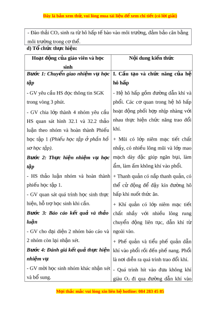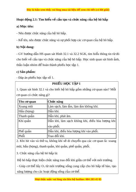 Đây là bản xem th , vu ử i lòng mua tài li u ệ đ xe ể m chi ti t ế (có l i ờ gi i ả ) Hoạt đ ng 2.1 ộ : Tìm hi u v ể c ề u t ấ o và ch ạ c năng c ứ a h ủ hô h ệ p ấ a) M c t ụ iêu: - Nêu đư c ợ ch c năng c ứ a ủ h hô h ệ p. ấ - K t ể ên, nêu đư c ợ ch c năng ứ và s ph ự i ố h p các ợ c quan c ơ a ủ h hô h ệ p. ấ b) N i ộ dung: - GV hư ng ớ d n