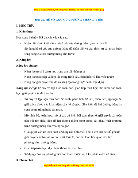 BÀI 29. HỆ SỐ GÓC CỦA ĐƯỜNG THẲNG (2 tiết) I. MỤC TIÊU: