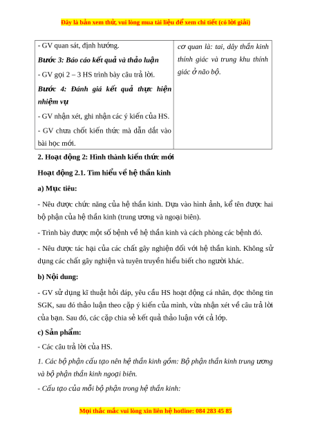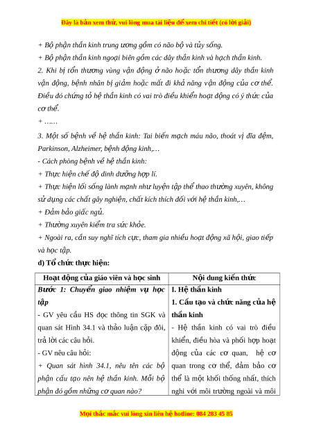 Đây là bản xem th , vu ử i lòng mua tài li u ệ đ xe ể m chi ti t ế (có l i ờ gi i ả ) - SGK, SGV, SBT khoa h c ọ tự nhiên 8, kế ho ch ạ bài d y ạ , các hình nh ả theo sách giáo khoa và hình nh ả liên quan đ n bài ế h c. ọ - Phi u t ế rả l i ờ câu h i ỏ c a ủ nhóm. 2. H c s ọ inh: - SGK, SBT khoa h c ọ t nhi ự ên 8. - Đ c nghi ọ ên c u ứ và tìm hi u t ể rư c ớ bài nhà. ở III. TI N Ế TRÌNH D Y Ạ H C Ọ 1. Hoạt đ ng 1 ộ : Kh i ở đ ng ( ộ M đ ở u) ầ a) M c t ụ iêu: - T o h ạ ng ứ thú h c ọ t p cho h ậ c ọ sinh và t ng ừ bư c l ớ àm quen bài h c. ọ b) N i ộ dung: - HS trả l i ờ câu h i ỏ : “Nh ng ữ cơ quan nào c a ủ con ngư i ờ tham gia vào quá trình ti p ế nh n hì ậ nh nh, ả âm thanh?” c) S n ph ả m ẩ : - Câu tr l ả i ờ c a ủ h c s ọ inh. d) T ch ổ ức thực hi n: ệ Hoạt đ ng c ộ a