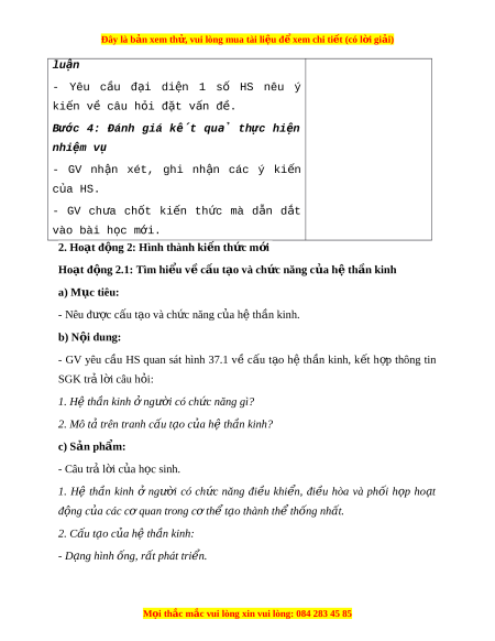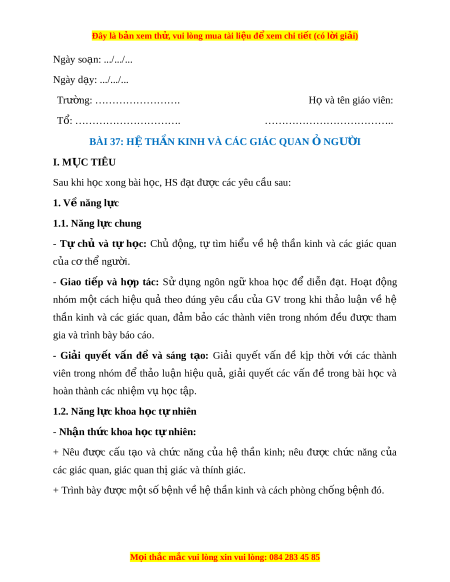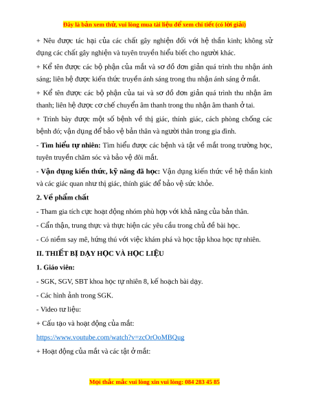 Đây là bản xem th , vu ử i lòng mua tài li u ệ đ xe ể m chi ti t (c ế ó l i ờ gi i ả ) + Nêu đư c ợ tác h i ạ c a ủ các ch t ấ gây nghi n ệ đ i ố v i ớ hệ th n ầ kinh; không sử d ng các ụ chất gây nghi n và t ệ uyên truy n ề hi u bi ể t ế cho ngư i ờ khác. + Kể tên đư c ợ các bộ ph n ậ c a ủ m t ắ và sơ đồ đ n ơ gi n ả quá trình thu nh n ậ ánh sáng; liên h đ ệ ư c ki ợ n t ế h c ứ truy n ánh s ề áng trong thu nh n ánh s ậ áng m ở t ắ . + Kể tên đư c ợ các bộ ph n ậ c a ủ tai và sơ đồ đ n ơ gi n ả quá trình thu nh n ậ âm thanh; liên h đ ệ ư c ợ c ch ơ chuy ế n ể âm thanh trong thu nh n ậ âm thanh t ở ai. + Trình bày đư c ợ m t ộ số b nh