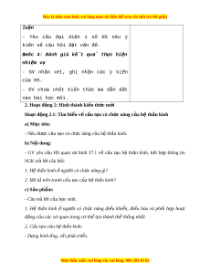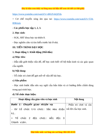 ề sóng âm qua tai: https://www.voutube.com/watch?v=TJ4- R9Kitzk - Các phi u h ế c t ọ p 1, 2, 3. ậ 2. H c ọ sinh: - SGK, SBT khoa h c ọ t nhi ự ên 8. - Đ c nghi ọ ên c u ứ và tìm hi u t ể rư c ớ bài nhà. ở III. TI N Ế TRÌNH D Y Ạ H C Ọ 1. Hoạt đ ng 1 ộ : Kh i ở đ ng ( ộ M đ ở u) ầ a) M c t ụ iêu: - Dẫn d t ắ gi i ớ thi u ệ v n ấ đ , ề để h c ọ sinh bi t ế về h ệ th n ầ kinh và các giác quan c a ủ ngư i ờ . b) N i ộ dung: - Tổ ch c t ứ rò ch i ơ đ g ể i ợ m v ở v ề n đ ấ bài ề h c. ọ c) Sản phẩm: - H c ọ sinh bư c ớ đ u ầ nêu suy nghĩ c a ủ b n ả thân và có hư ng ớ đi u ề ch nh ỉ đúng trong quá trình h c. ọ