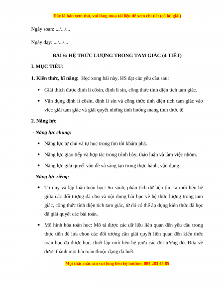 BÀI 6: HỆ THỨC LƯỢNG TRONG TAM GIÁC (4 TIẾT) I. MỤC TIÊU: