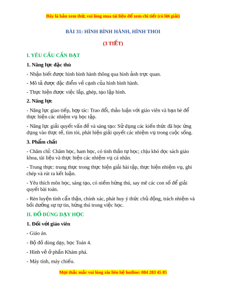 ợ hình bình hành thông qua hình nh ả tr c quan. ự - Mô tả đư c đ ợ c ặ đi m ể v c ề nh ạ c a hì ủ nh bình hành. - Th c hi ự n đ ệ ư c ợ vi c l ệ p, ắ ghép, t o l ạ p ậ hình. 2. Năng l c ự - Năng l c gi ự ao ti p, h ế p ợ tác: Trao đ i ổ , th o ả lu n v ậ i ớ giáo viên và b n bè đ ạ ể th c ự hi n các ệ nhi m ệ vụ h c t ọ p. ậ - Năng l c gi ự i ả quy t ế v n đ ấ và s ề áng t o: ạ S d ử ng các ụ ki n ế th c đã h ứ c ọ ng ứ d ng vào ụ th c t ự , t ế ìm tòi, phát hi n gi ệ i ả quy t ế các nhi m ệ v t ụ rong cu c s ộ ng. ố 3. Phẩm ch t ấ - Chăm ch : ỉ Chăm h c, ham ọ h c, ọ có tinh th n t ầ h ự c; ọ ch u khó đ ị c s ọ ách giáo khoa, tài li u và t ệ h c ự hi n các ệ nhi m ệ vụ cá nhân. - Trung th c: ự trung th c t ự rong th c hi ự n gi ệ i ả bài t p, ậ th c hi ự n nhi ệ m ệ v , ụ ghi chép và rút ra k t ế lu n. ậ - Yêu thích môn h c, s ọ áng t o, có ạ ni m ề h ng t ứ hú, say mê các con s đ ố gi ể i ả quy t ế bài toán. - Rèn luy n t ệ ính c n t ẩ h n, chí ậ nh xác, phát huy ý th c ch ứ đ ủ ng, ộ trách nhi m ệ và bồi dư ng s ỡ ự t t ự in, h ng t ứ hú trong vi c h ệ c. ọ II. Đ D Ồ ÙNG D Y Ạ H C Ọ 1. Đ i ố v i ớ giáo viên - Giáo án. - Bộ đồ dùng d y ạ , h c ọ Toán 4. - Hình v ẽ ph ở n K ầ hám phá. - Máy tính, máy chi u. ế M i