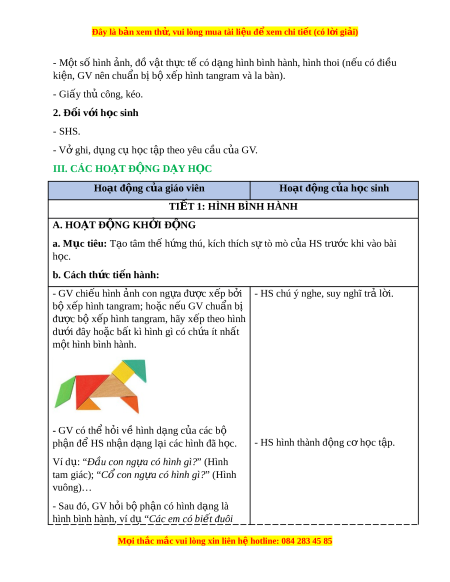 Ế 1: HÌNH BÌNH HÀNH A. HOẠT Đ N Ộ G KH I Ở Đ N Ộ G a. Mục tiêu: T o t ạ âm th h ế ng t ứ