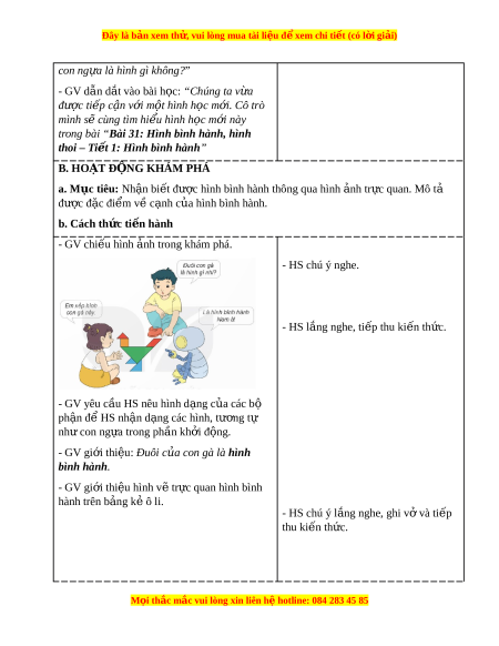 ợ hình bình hành thông qua hình nh t ả r c quan. M ự ô t ả đư c đ ợ ặc đi m ể v c ề nh ạ c a hì ủ nh bình hành. b. Cách th c t ứ i n hành ế - GV chi u hì ế nh nh ả trong khám phá. - HS chú ý nghe. - HS l ng nghe, t ắ i p t ế hu ki n t ế h c. ứ