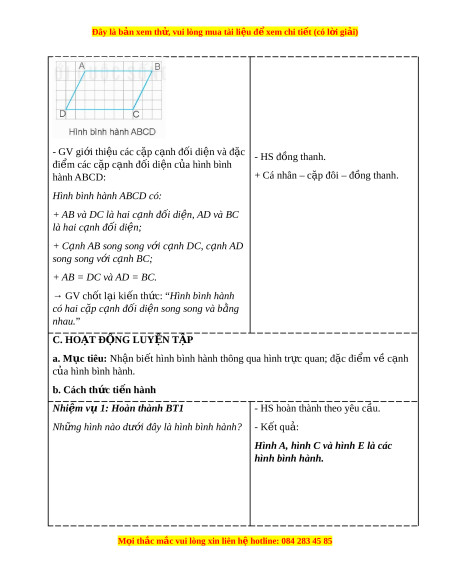 Đây là bản xem th , vu ử i lòng mua tài li u ệ đ xe ể m chi ti t (c ế ó l i ờ gi i ả ) - GV gi i ớ thi u các c ệ p ặ c nh ạ đ i ố di n và đ ệ c ặ - HS đ ng t ồ hanh. đi m ể các c p ặ c nh ạ đối di n c ệ a hì ủ nh bình hành ABCD: + Cá nhân – c p ặ đôi – đ ng t ồ hanh.