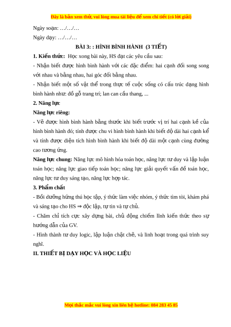 ệ tích hình bình hành khi bi t ế độ dài m t ộ c nh ạ cùng đư ng ờ cao tư ng ơ ng. ứ Năng l c ự chung: Năng l c ự mô hình hóa toán h c, ọ năng l c ự t ư duy và l p ậ lu n ậ toán h c; ọ năng l c ự giao ti p ế toán h c; ọ năng l c ự gi i ả quy t ế v n ấ đề toán h c, ọ năng l c t ự duy s ư áng t o, năng ạ l c h ự p t ợ ác. 3. Ph m ẩ chất - Bồi dư ng ỡ h ng t ứ hú h c t ọ p, ậ ý th c l ứ àm vi c nhóm ệ , ý th c t ứ ìm tòi, khám phá và sáng t o cho H ạ S ⇒ đ c l ộ p, ậ t t ự in và t ch ự . ủ - Chăm chỉ tích c c ự xây d ng ự bài, chủ đ ng ộ chi m ế lĩnh ki n ế th c ứ theo sự hư ng d ớ ẫn c a G ủ V.