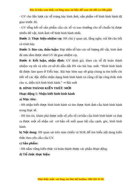 Đây là bản xem th , vu ử i lòng mua tài li u ệ đ xe ể m chi ti t ế (có l i ờ gi i ả ) - GV cho l n ầ lư t ợ các tổ tr ng ư bày hình nh, ả s n ả ph m ẩ v ề hình bình hành đã giao trư c ớ đó. - GV t ng ổ k t ế số s n ả ph m ẩ c a ủ các tổ và trao thư ng ở cho tổ chu n ẩ bị đư c ợ nhi u đ ề ồ v t ậ , hình nh v ả ề hình bình hành nh t ấ . Bư c ớ 2: Th c ự hi n ệ nhi m ệ v :