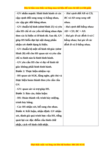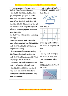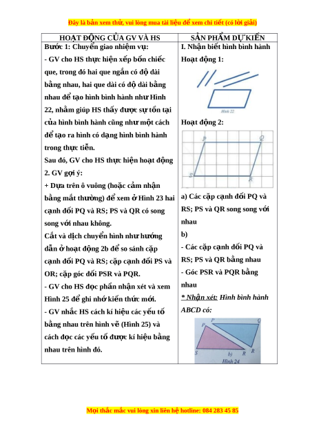 Đây là bản xem th , vu ử i lòng mua tài li u ệ đ xe ể m chi ti t ế (có l i ờ gi i ả ) HOẠT Đ N Ộ G C A Ủ GV VÀ HS SẢN PHẨM D K Ự I N Ế Bư c ớ 1: Chuy n gi ể ao nhi m ệ v : ụ I. Nhận bi t ế hình bình hành - GV cho HS th c hi ự n x ệ p b ế n chi ố c ế Hoạt đ ng 1 ộ :