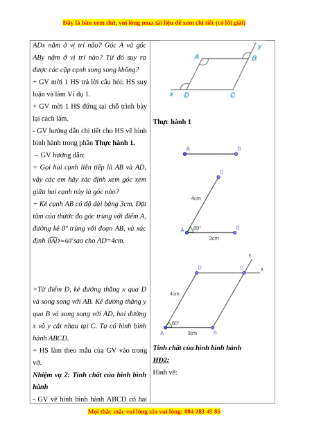 - Giải thích được các tính chất của hình bình hành; dựa vào các tính chất đó để