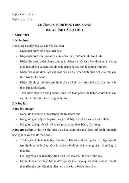 BÀI 3. HÌNH CẦU (2 TIẾT) I. MỤC TIÊU: