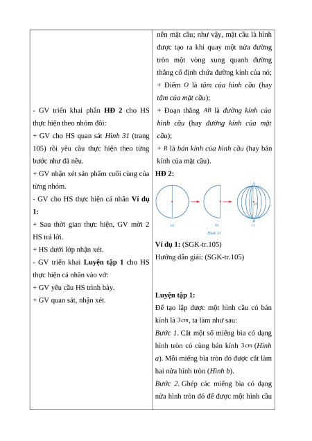 - HS mô tả được tâm, bán kính của hình cầu, tạo lập được hình cầu, mặt cầu.