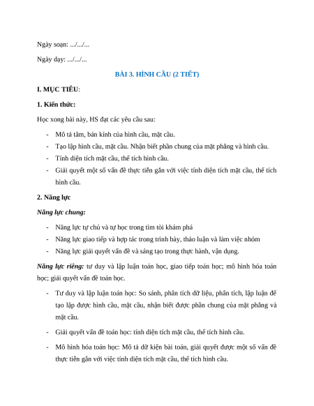 BÀI 3. HÌNH CẦU (2 TIẾT) I. MỤC TIÊU: