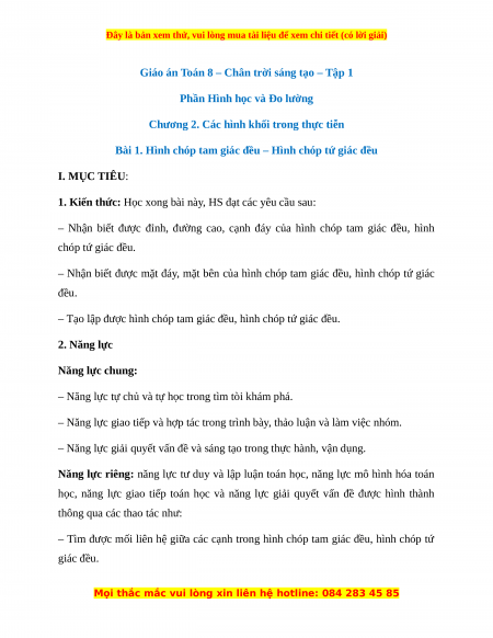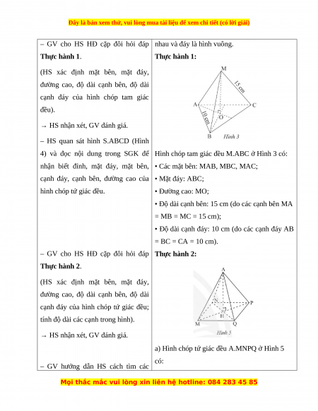 Giáo án Hình chóp tam giác đều – Hình chóp tứ giác đều Toán 8 Chân trời sáng tạo