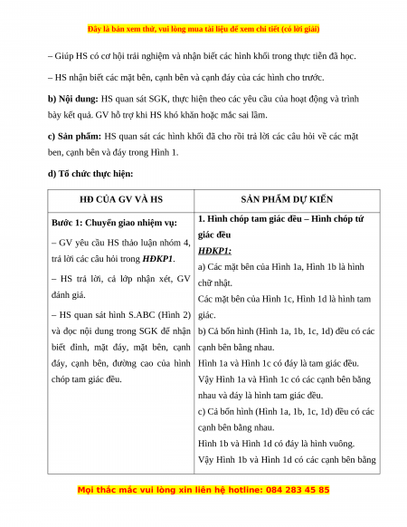 – Nhận biết được mặt đáy, mặt bên của hình chóp tam giác đều, hình chóp tứ giác