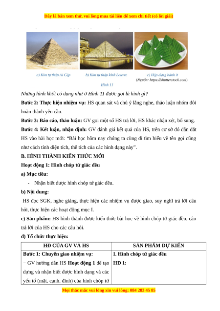 Giáo án Hình chóp tứ giác đều Toán 8 Cánh diều