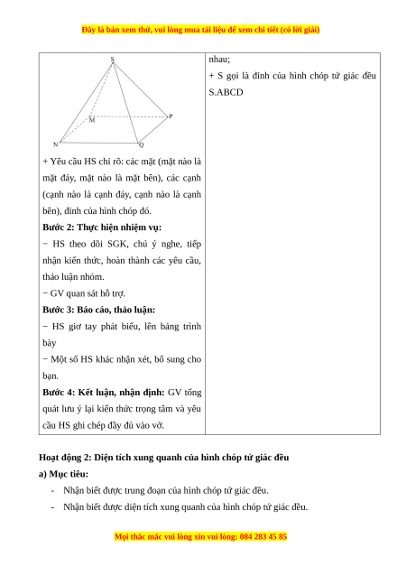 - Nhận biết được diện tích xung quanh của hình chóp tứ giác đều.