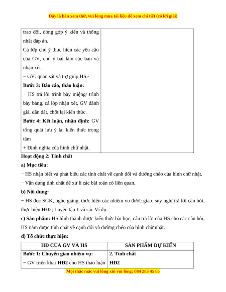 − HS nhận biết và phát biểu các tính chất về cạnh đối và đường chéo của hình chữ nhật.
